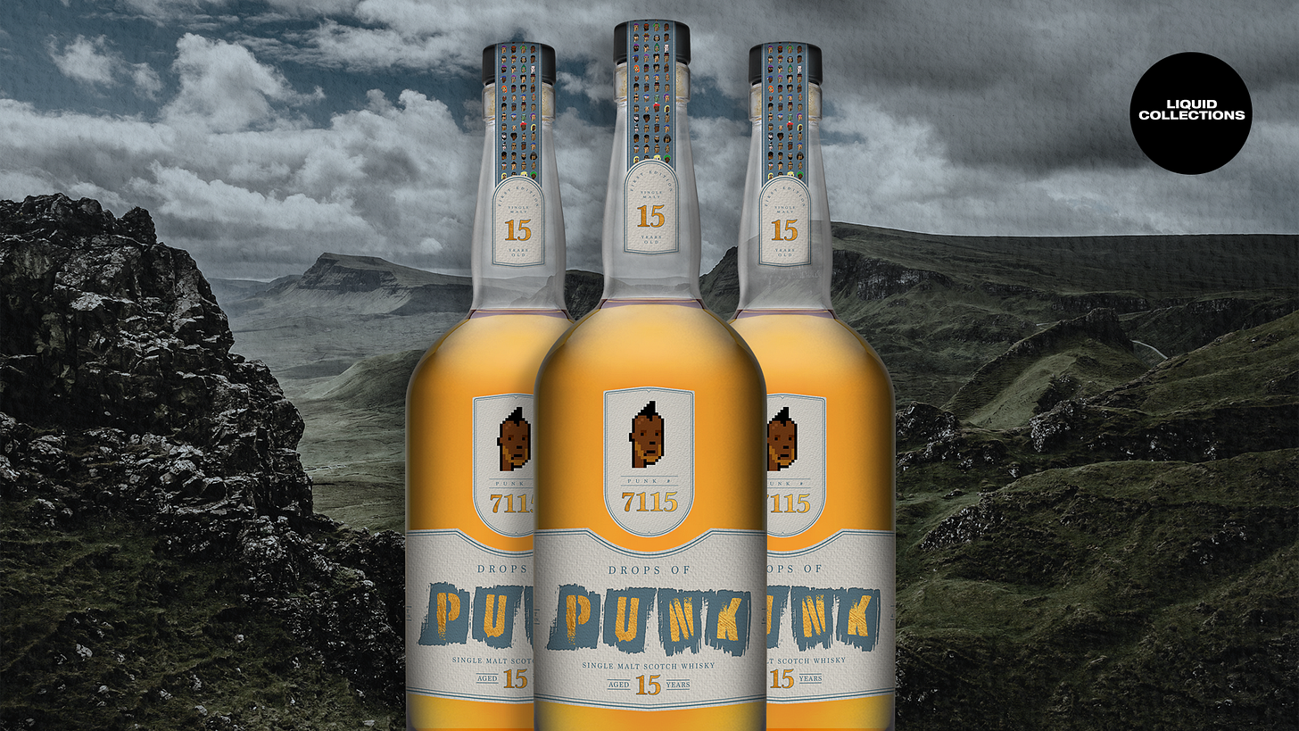 Liquid Collections has carefully sourced a superb single cask of 15-year-old Highland single malt scotch (aged in an ex-bourbon cask and enhanced in a 2nd fill Oloroso sherry cask for added complexity) exclusively for CryptoPunk holders. Each NFT entitles the owner to six distinctive bottles, showcasing your CryptoPunk integrated into the bottle design.